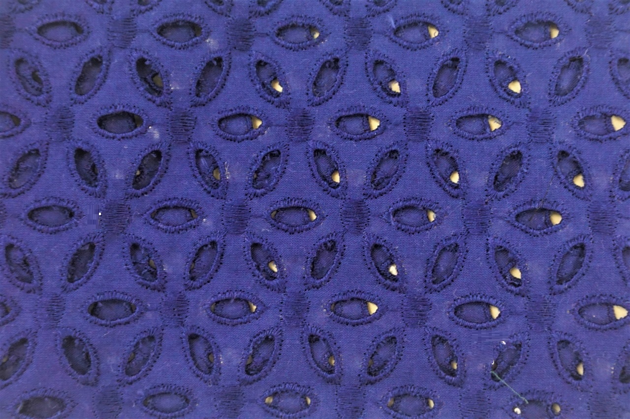 お花のように見える刺しゅうが綺麗なネイビーカラーの綿レースです。エレガントでシックに決めたいときにおすすめです。