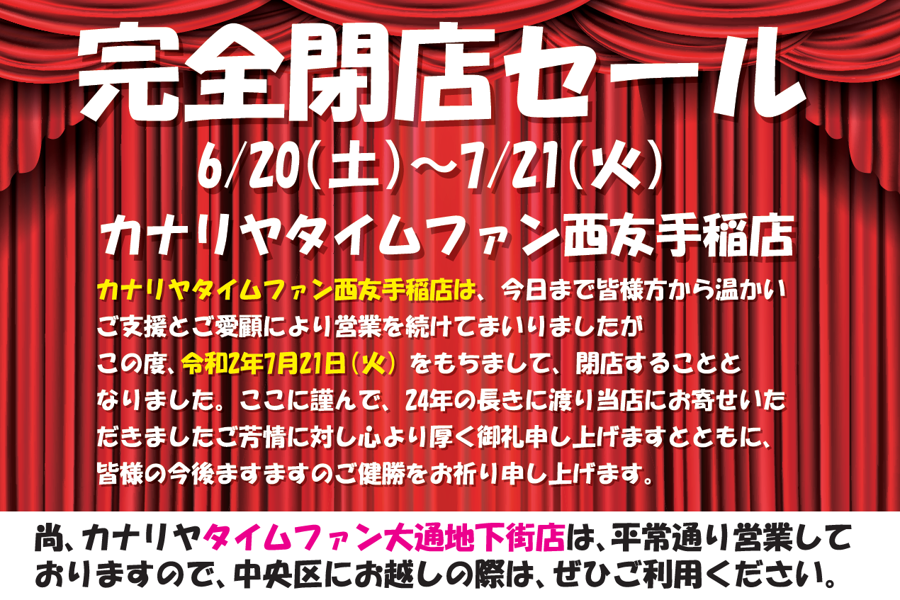 2020年6月20日(土)~7月21日(火)までの期間、タイムファン西友手稲店は「完全閉店セール」を開催致します。