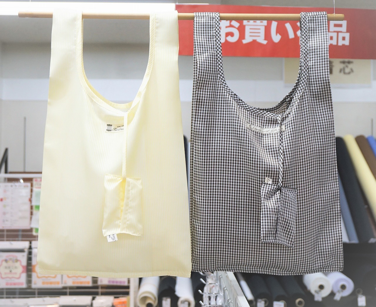 無地やギンガムチェック、迷彩柄などが揃った、折りたためるエコバッグを只今展示中!!