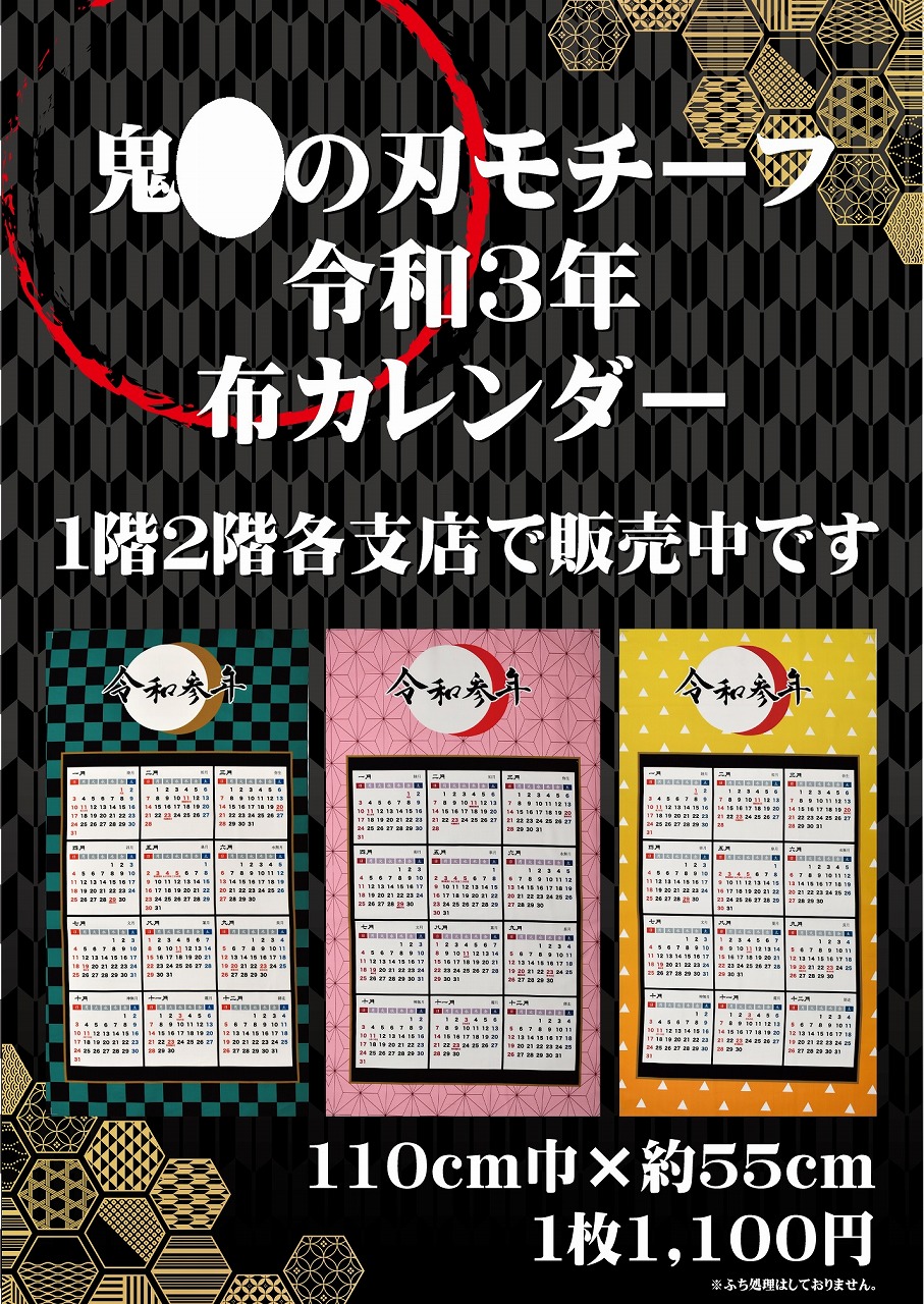 この連休中にて、カナリヤでは人気漫画・アニメの「鬼●の刃」モチーフになった、令和3年度(2021年)の布製パネルカレンダー発売致しました!