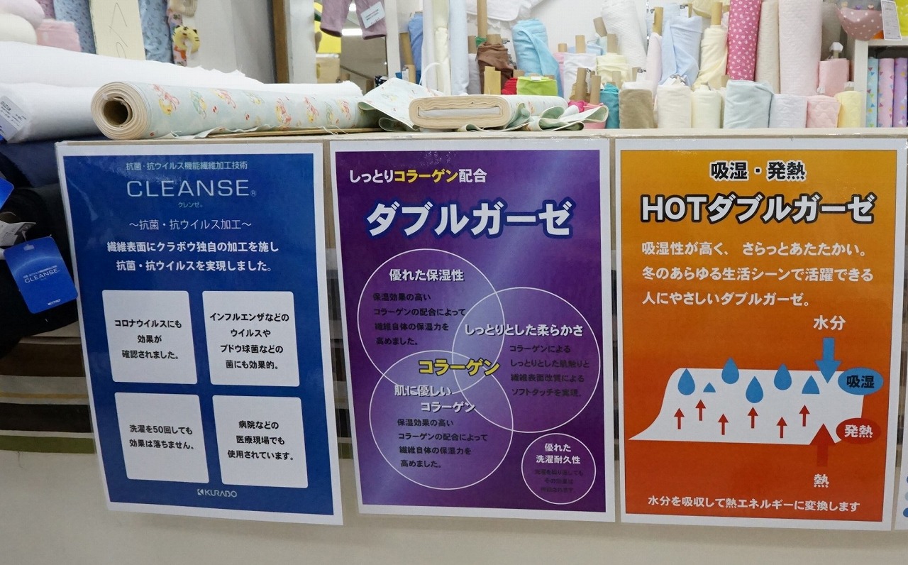 抗菌・抗ウイルス加工されたガーゼ生地でございます。繊維表面にクラボウ独自の繊維加工技術が施された「クレンゼ」は、1階でも注目の生地になります。