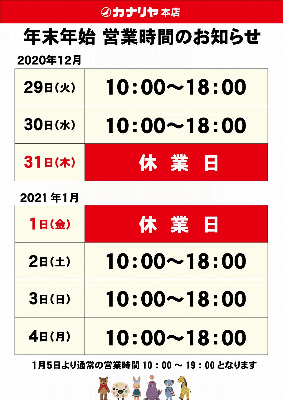 2021年1月5日(火)より、通常営業10:00~19:00となります。