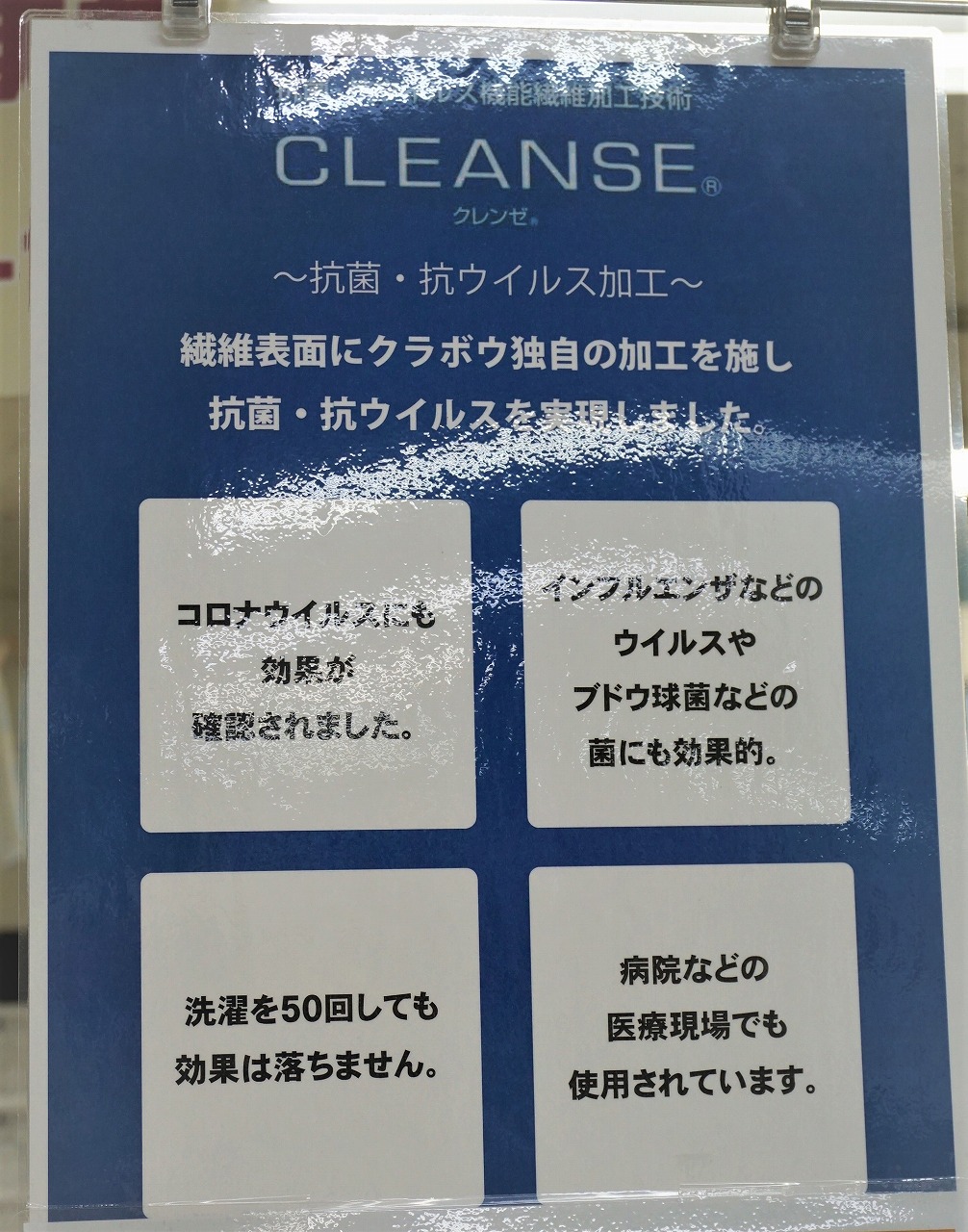 抗菌・抗ウイルス機能繊維加工技術がなされた生地でして、繊維の表面にクラボウ独自の加工を施しております。医療に携わる方の白衣やカーテンにも使われる抗菌・抗ウイルス生地であり、お洗濯を50回しても効果は落ちず、新型コロナウイルスにも効果が確認されております。ウイルスの減少率は99%以上といわれているのでマスクの裏地におすすめです。