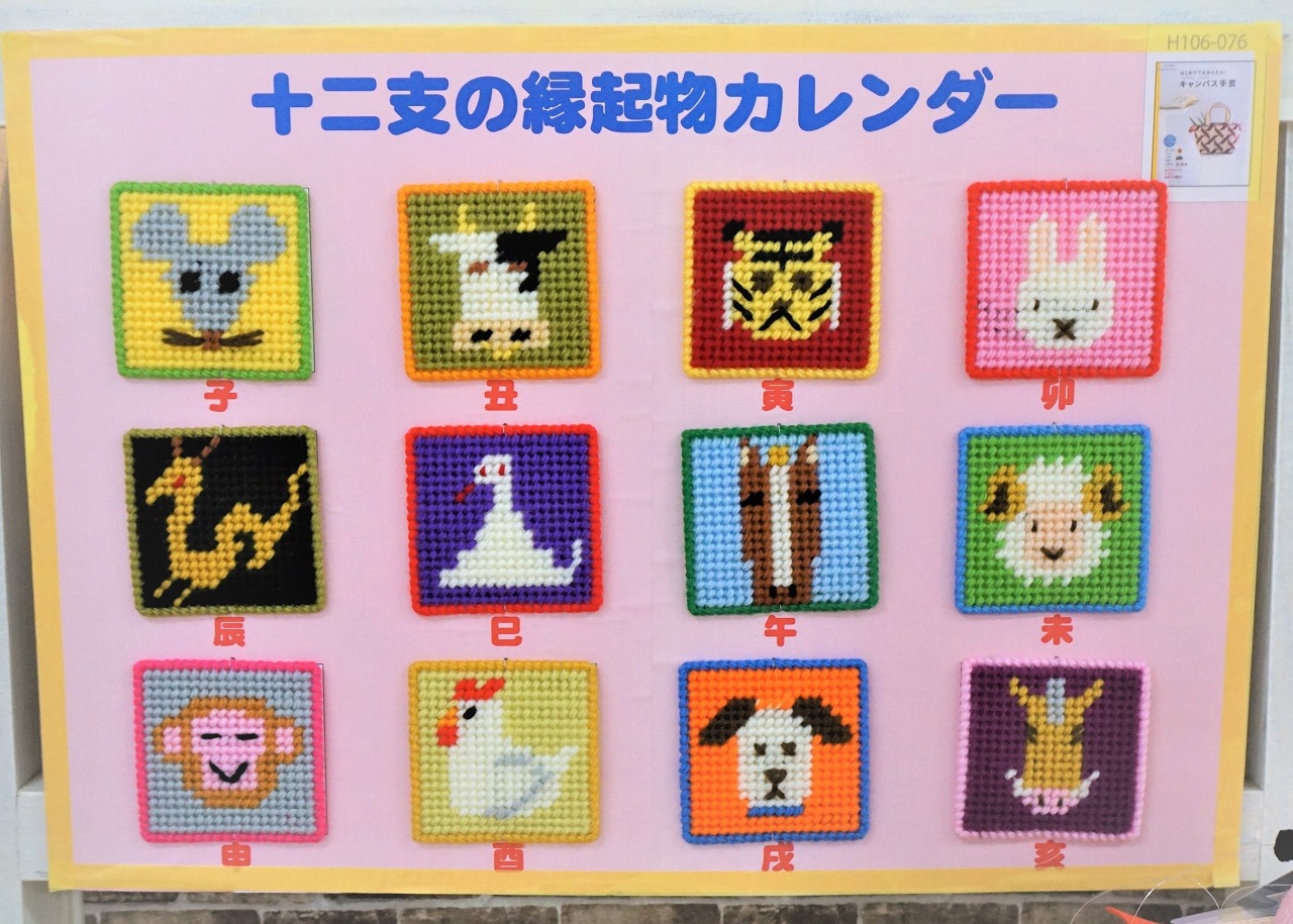 長年飾れちゃう可愛い干支の縁起物カレンダー見本です!干支モチーフは「はじめてでもかんたん!キャンバス手芸」という本を参考にしています。