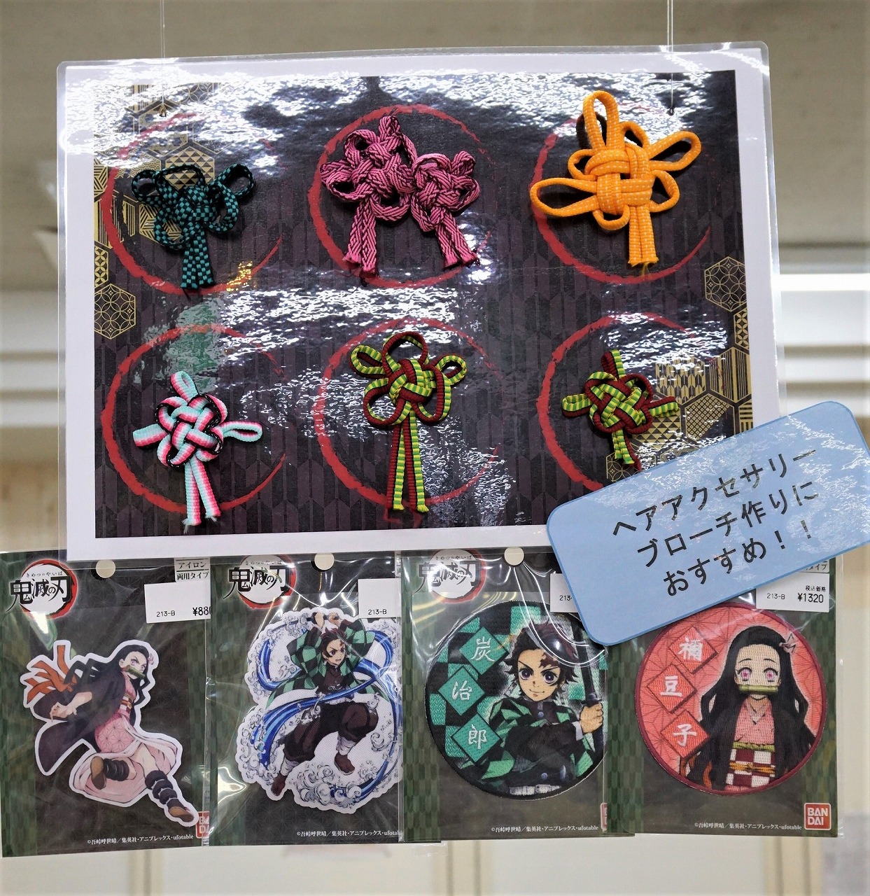 こちらは3階に商品の取り扱いのある「加賀紐」と「キャラクターワッペン」を展示致しております。加賀紐の使い方次第でカバンやヘアアクセサリーやブローチ、巾着やマスクの紐使いに◎ワッペンは入園入学アイテムにアイロンでくっつけることが出来ます。