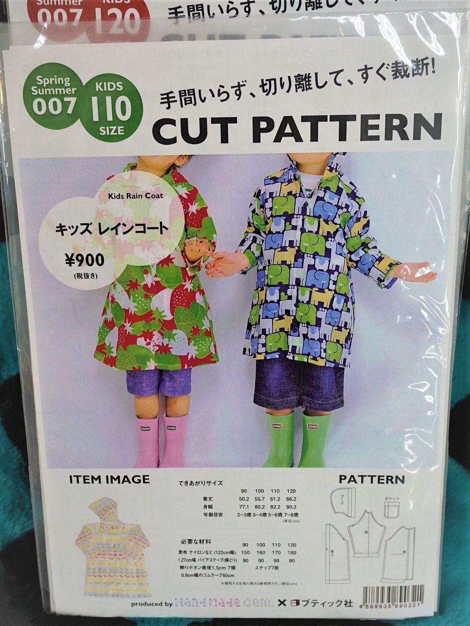 参考型紙はカナリヤでも裁縫好きな方に人気のある「CUT PATTERN」キッズサイズの「キッズレインコート」を使用しています。サイズ展開も100~120がございます。