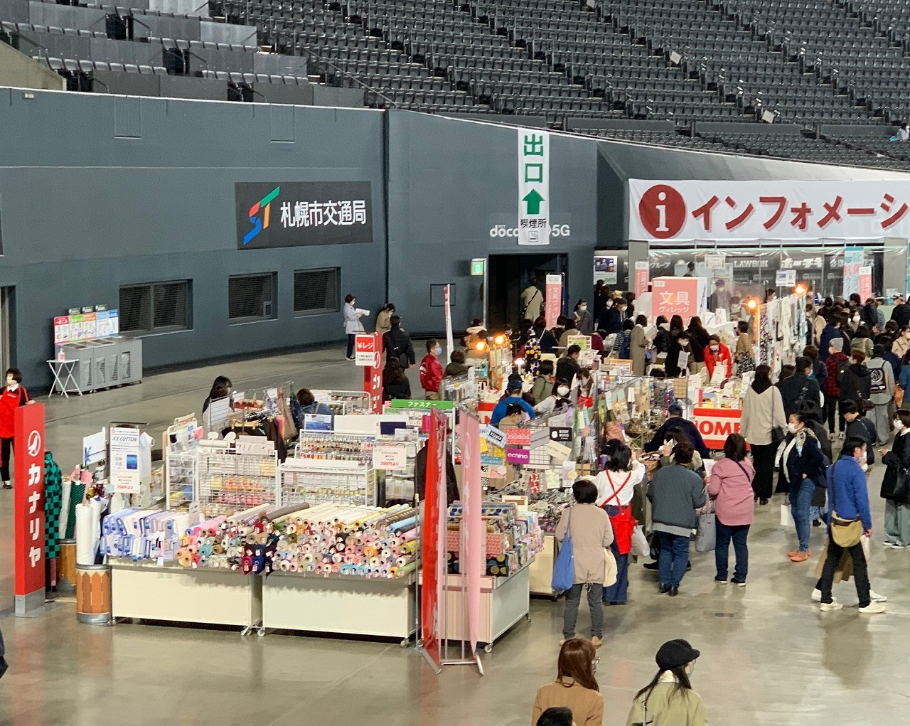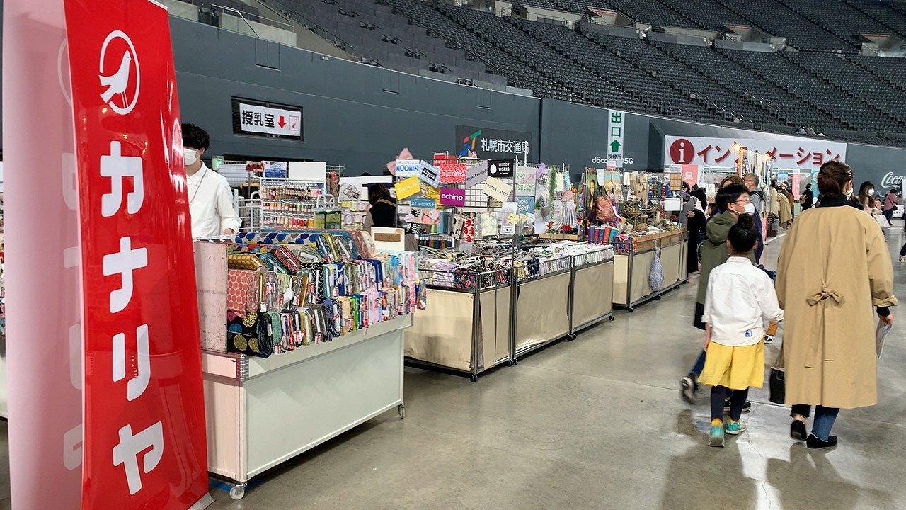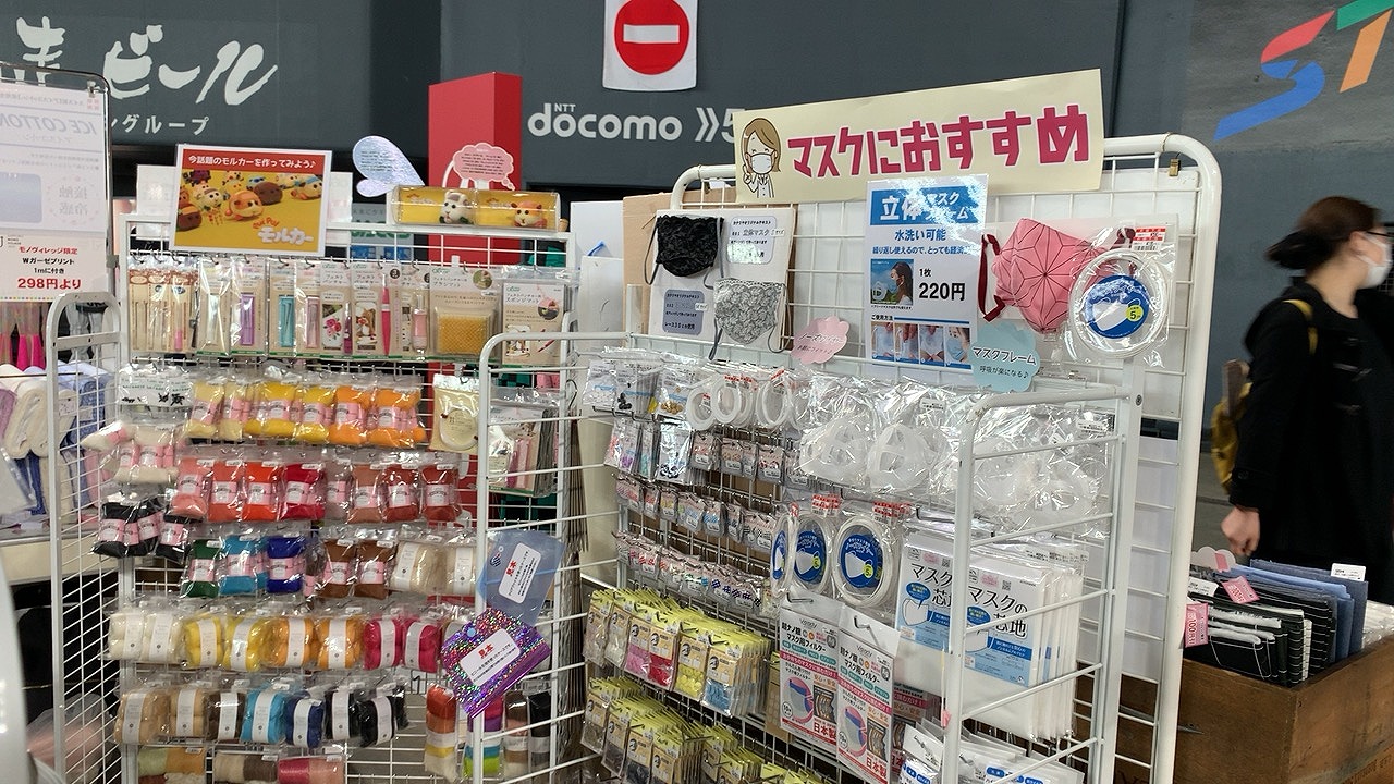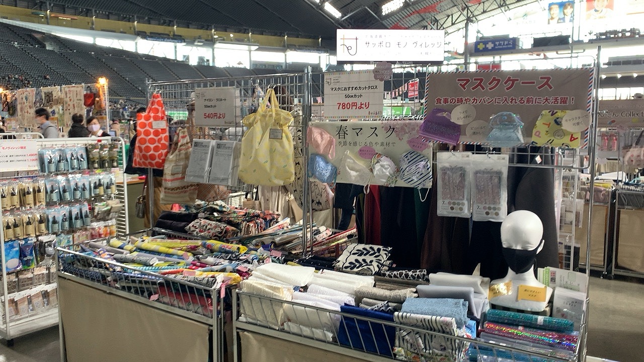 カナリヤブースではマスク作りにおすすめの生地やアイテムを中心に、アニメプリント、フェルト羊毛などのクラフト、洋裁付属、レザー、ナイロン、毛糸等を販売致しました。お客様も主にマスクに関する表生地やマスク裏のガーゼ生地、カットクロス等やゴム等ご覧頂いたりお買い物されていました。