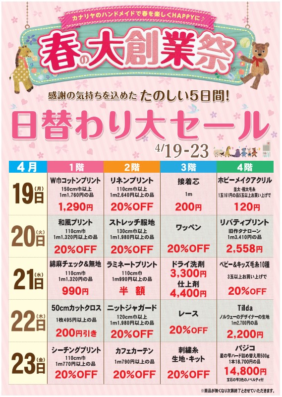 期間中、4月19日(月)~23日(金)の5日間、カナリヤ本店のみ「日替わり大セール」を行います。 【終了致しました】