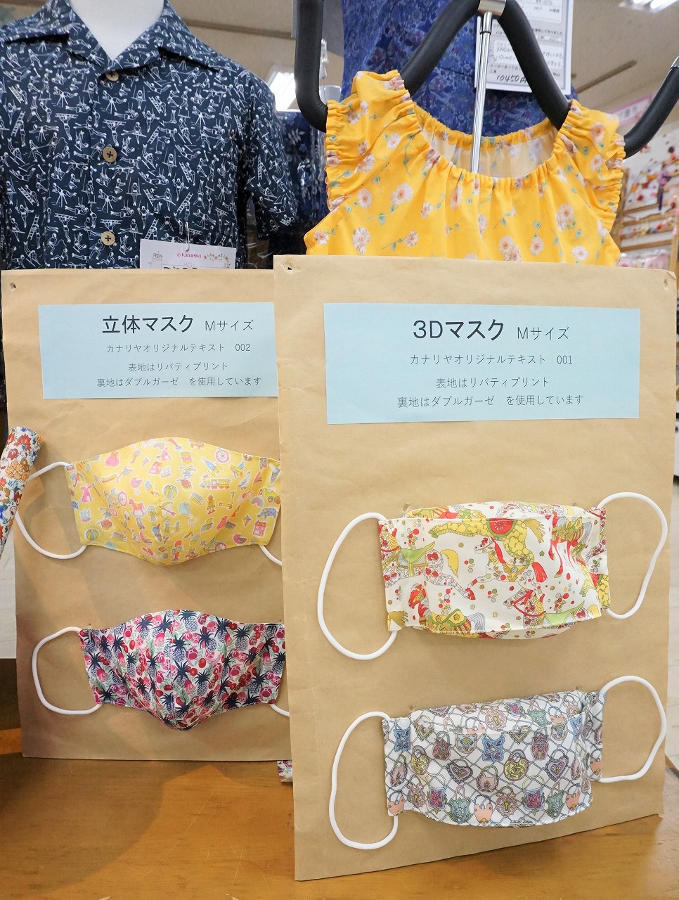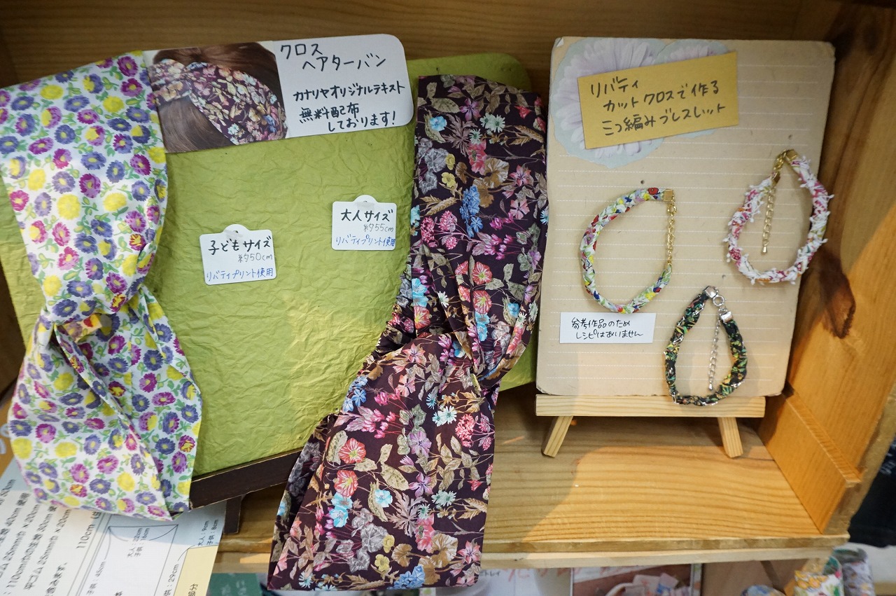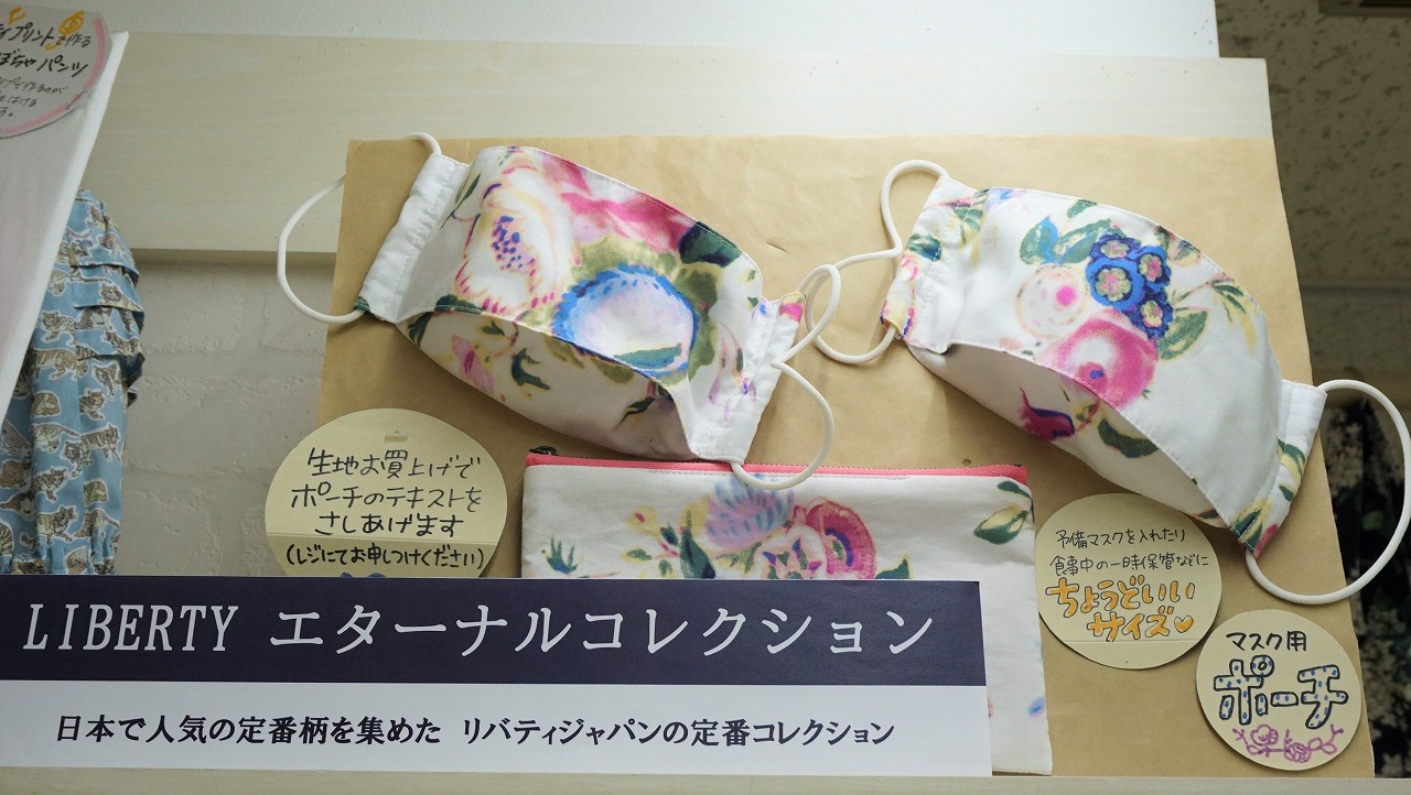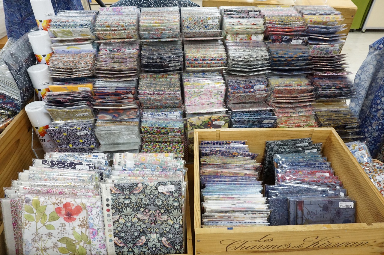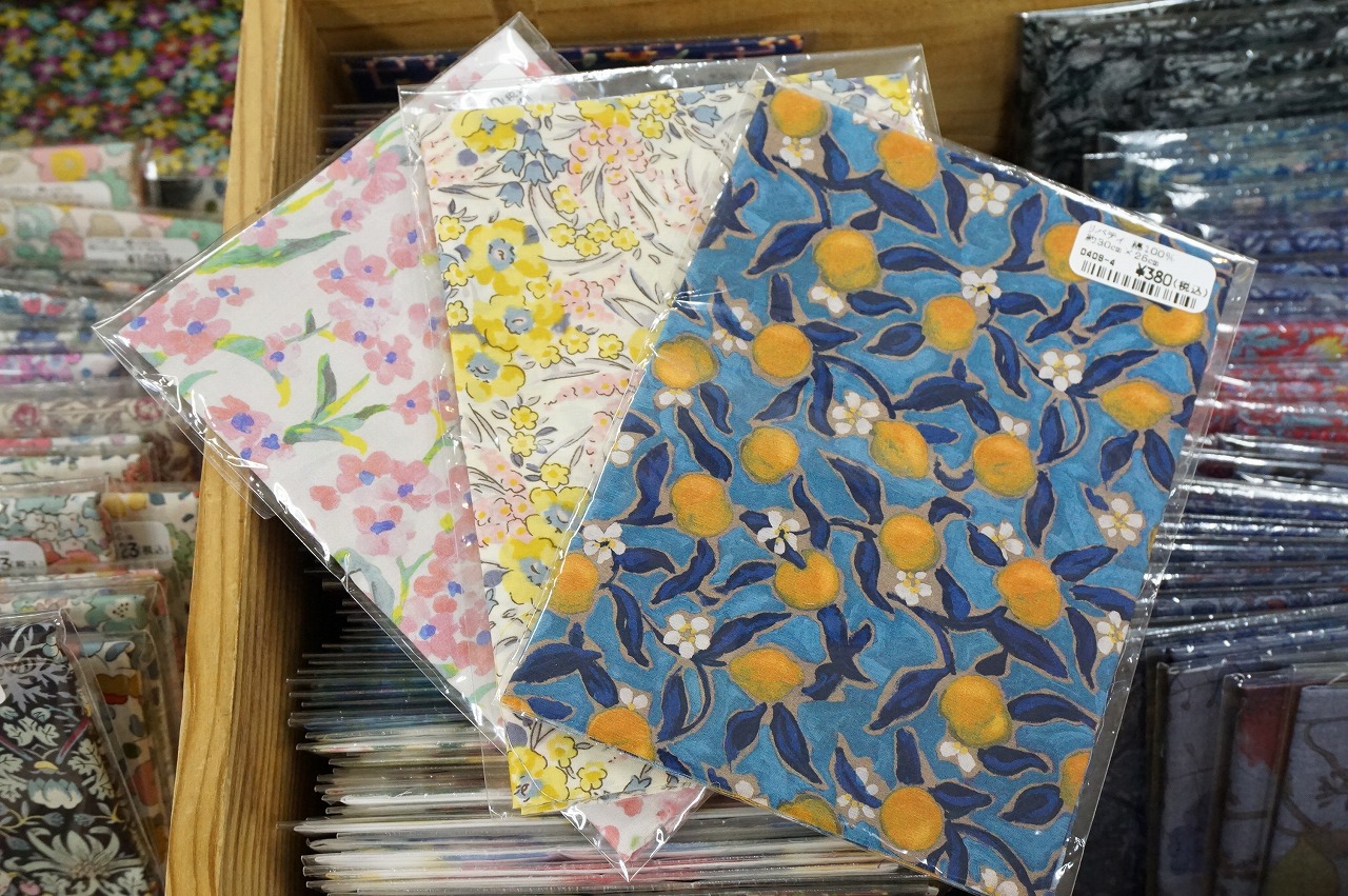 リバティプリントを使った見本やカットクロスが豊富で、パッチワークやマスク、小物作りに◎