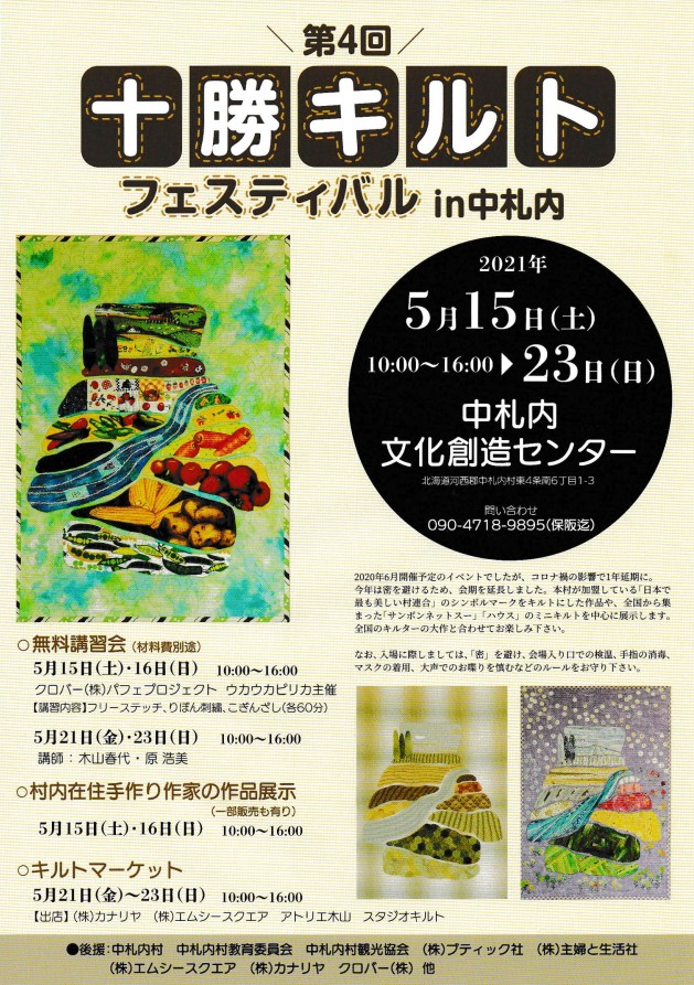 2021年5月15日(土)~23日(日)まで、中札内文化創造センターにて「第4回 十勝キルトフェスティバル in 中札内」にカナリヤも参加致します。5/21(金)~23(日)「キルトマーケット」に出店致します。 (中止になりました)