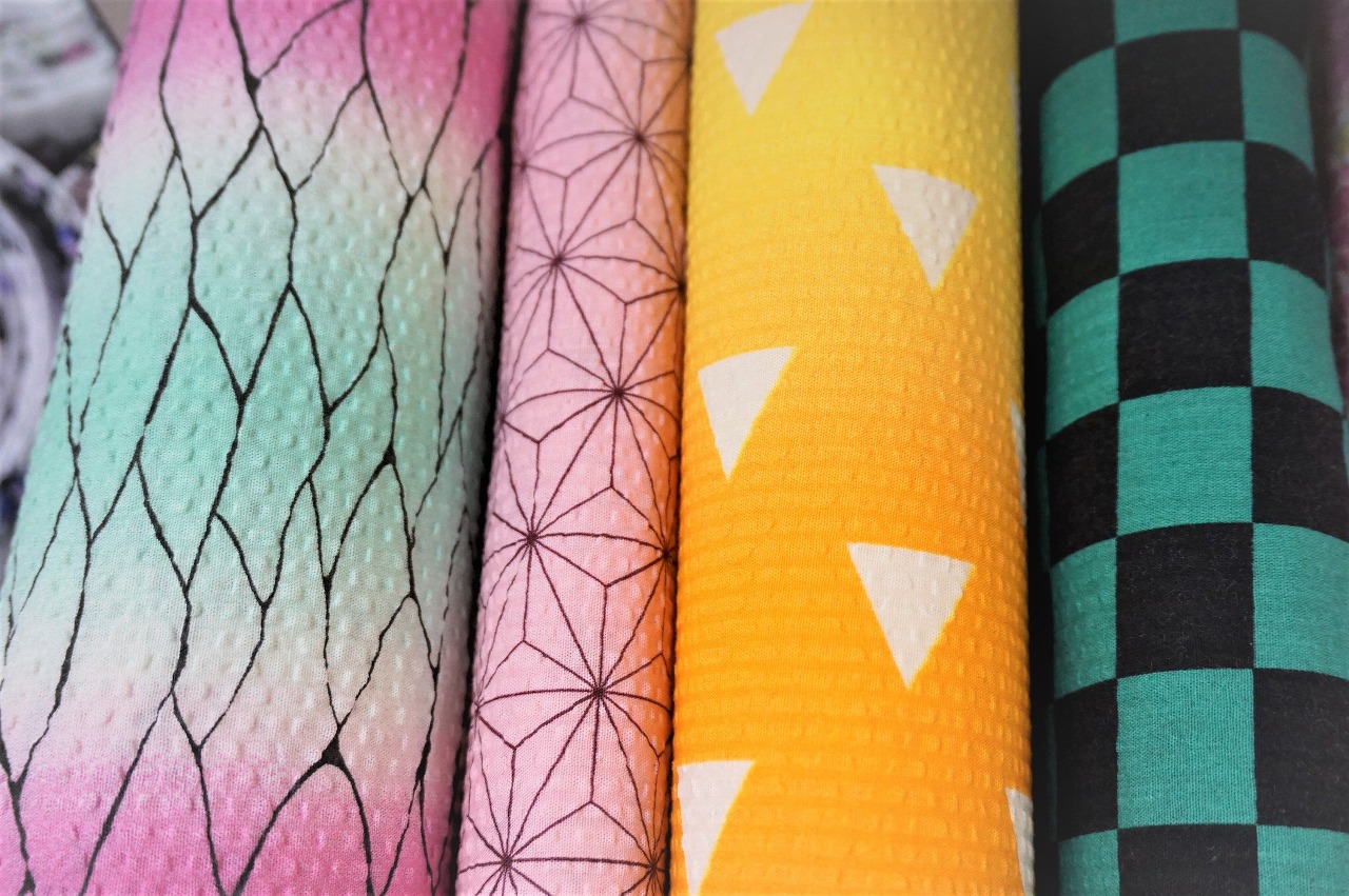 カナリヤ本店1階には鬼滅風のアニメプリントの新柄や浴衣・甚平に使えるリップル生地、手ぬぐいの新柄等が入荷致しました!