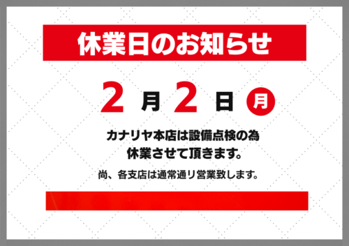 2026.01.11 イベント・催事 ⭐〈本店〉2/2㈪は休業日です。 -カナリヤ本店からお知らせです- 2026年2月2日(月) カナリヤ本店は設備点検の為、休業させて頂きます。 尚、各支店は通常... 詳しく見る