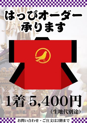 ☆本店2階からのお知らせです☆ イベントに最適☆ カナリヤ本店2階では、はっぴオーダーを承っております。 1着 5,400円(生地代別途)に...