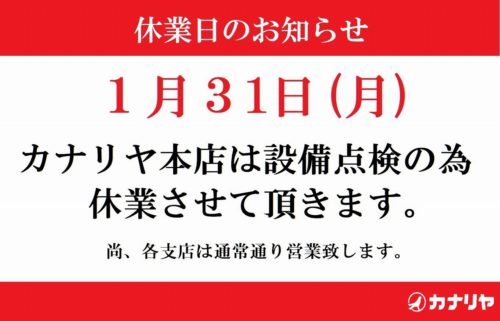 ーカナリヤ本店からのお知らせですー 2022年1月31日(月)は カナリヤ本店は設備点検の為、休業させて頂きます。 尚、各支店は通常通り営業...