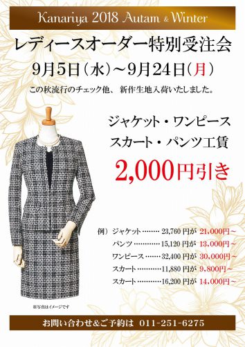 ☆カナリヤ本店2階からのお知らせです☆ 2018年9月5日(水)~24日(月・祝)までの期間、 カナリヤ本店2階にて「レディースオーダー特別...