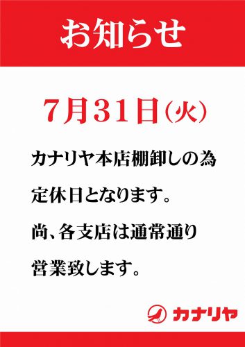 ↓終了致しました。 ☆カナリヤ本店からのお知らせです☆ 2018年7月31日(火)は カナリヤ本店棚卸しの為、定休日とさせて頂きます。 尚、...
