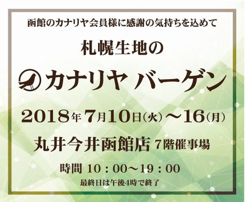 ↓終了致しました。 ☆カナリヤからのお知らせです☆ 2018年7月18日(水)~8月12日(日)までの期間、カナリヤ本店・各支店にて「カナリ...