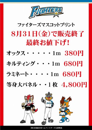 <カナリヤからのお知らせです> ファイターズマスコットプリントは 2018年8月31日(金)を持ちまして販売終了とさせていただきます。 販売...