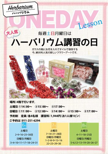 ↓終了致しました。 2018年6月・7月・8月 毎週土曜・日曜・月曜にて 本店4階より、大人気で注目の「ハーバリウム」講習を開催! (終了)...