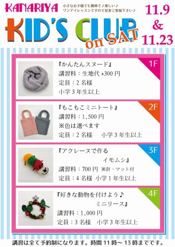 終了致しました。 ↓ ~本店キッズクラブ ご案内~ 小学生対象のキッズクラブ ☆ カナリヤ本店では「キッズクラブ」11月分(11/9・23 ...