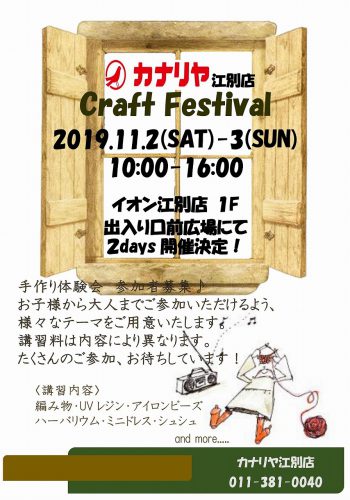↓終了致しました。 ☆江別店からのお知らせです☆ 2019年11月2日(土)・3日(日)の2日間、カナリヤ江別店にて「Craft Fest...