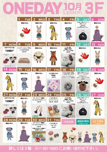 ↓終了致しました。 ~3階・4階ワンデーレッスンご案内~(10月分) カナリヤ本店3階・4階では、ワンデーレッスンが充実致しております。 ※...