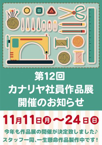 ☆予告☆ 2019年11月11日(月)~24日(日)までの期間、 カナリヤ本店にて「第12回カナリヤ社員作品展」を開催致します。  ...