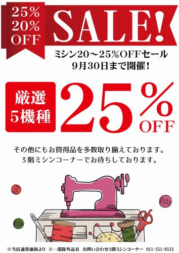 ↓ 終了致しました。 カナリヤ本店3階ミシンコーナーでは只今、ミシン20~25%OFFセールを行っております。9月30日(月)まで開催致して...