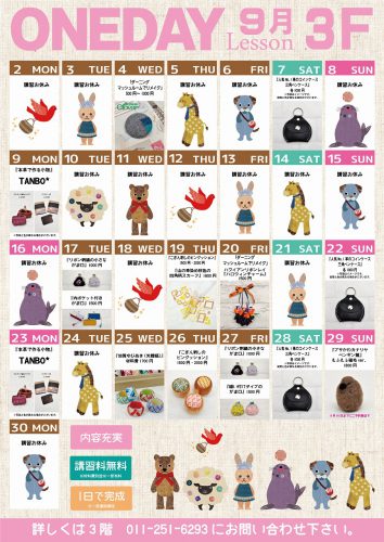 ↓ 終了致しました。 ~3階・4階ワンデーレッスンご案内~(9月分) カナリヤ本店3階・4階では、ワンデーレッスンが充実致しております。 ※...