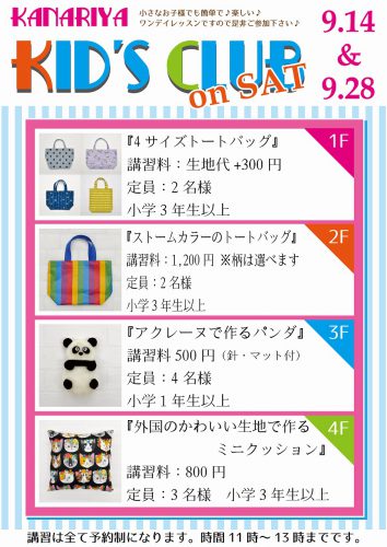 ↓ 終了致しました。 ~本店キッズクラブ ご案内~ 小学生対象のキッズクラブ ☆ カナリヤ本店では「キッズクラブ」9月分(9/14・28 土...