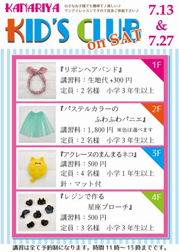↓ 終了致しました。 ~本店キッズクラブ ご案内~ 小学生対象のキッズクラブ ☆ カナリヤ本店では「キッズクラブ」7月分(7/13・27 土...
