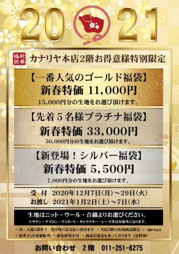 終了致しました。 ↓ ー本店2階からのお知らせですー 2021年度の新春福袋!カナリヤ本店2階お得意様特別限定の福袋をご紹介致...