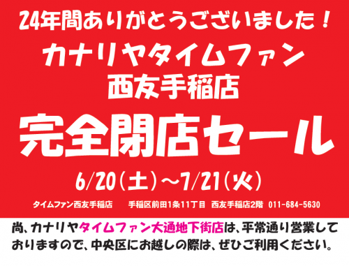 終了致しました。2020年7月21日(火)をもちましてタイムファン西友手稲店は閉店致しました。今までご愛顧頂き誠にありがとうございました。 ...