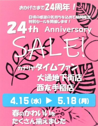 終了致しました。 ↓ ~タイムファンからのお知らせです~ カナリヤタイムファン大通地下街店はおかげさまで24周年! 日頃の感謝の気持ちを込め...