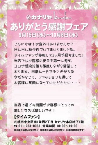 終了致しました。 ↓ ータイムファンからのお知らせですー 2021年9月15日(水)~10月6日(水)までの期間、タイムファンでは「ありがと...
