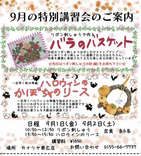 終了致しました。 ↓ ーカナリヤ帯広店からのお知らせですー 2023年9月1日(金)・2日(土)、カナリヤ帯広店にて「9月の特別講習会」のご...