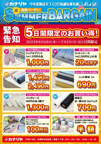 終了致しました。 ↓ カナリヤ本店より緊急告知! 「盛夏バーゲン」も残り5日間となりました。 2023年6月28日(水)~7月2日(日)の5...