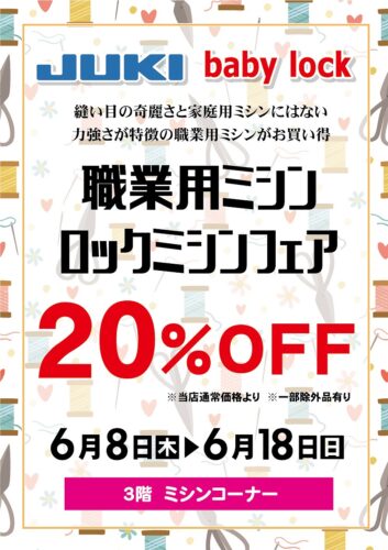 終了致しました。 ↓ ーカナリヤ本店3階ミシンコーナーからのお知らせですー 2023年6月8日(木)~6月18日(日)までの期間、カナリヤ本...