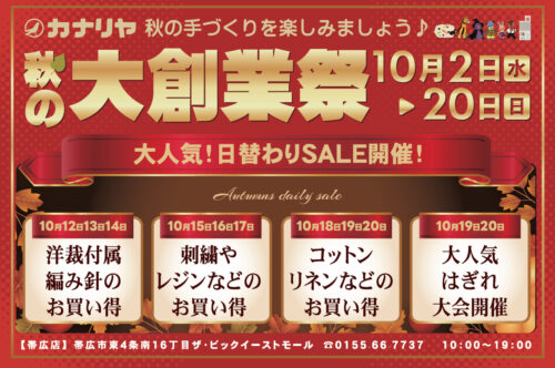 終了いたしました。 ー帯広店からのお知らせですー 2024年10月2日(水)~20日(日)にて、カナリヤ帯広店「秋の大創業祭」...