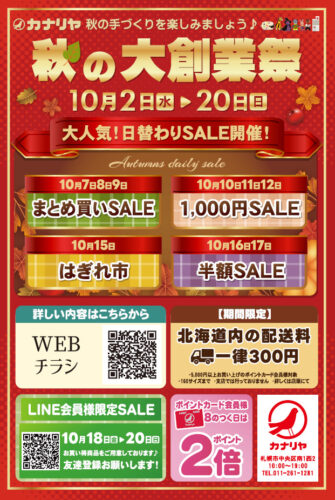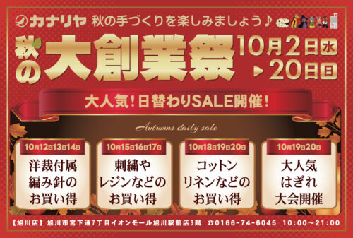 終了いたしました。 ー旭川店からのお知らせですー 2024年10月2日(水)~20日(日)にて、カナリヤ旭川店「秋の大創業祭」を開催致します...