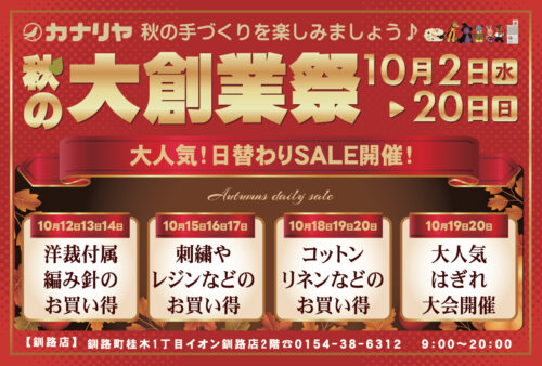 終了いたしました。 ー釧路店からのお知らせですー 2024年10月2日(水)~20日(日)にて、カナリヤ釧路店「秋の大創業祭」を開催致します...