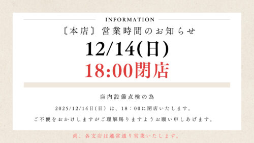 2025.12.09 イベント・催事 🌟年末年始営業時間のお知らせです<2025年~2026年> カナリヤ全店(カナリヤ本店・各支店・タイムファン)の 年末年始営業時間をお知らせ致します。 以下、2025年12月28日(日)~2026年1... 詳しく見る