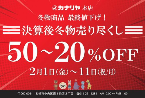 ☆カナリヤ本店からのお知らせです☆ 2019年2月1日(金)~11日(月・祝)までの期間、カナリヤ本店にて 「決算後冬物売り尽くし」を開催致...