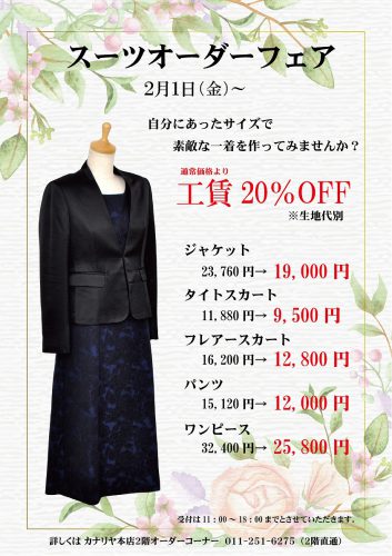 ☆カナリヤ本店2階からのお知らせです☆ 2019年2月1日(金)~カナリヤ本店2階では 「スーツオーダーフェア」を開催致しております。 ※終...