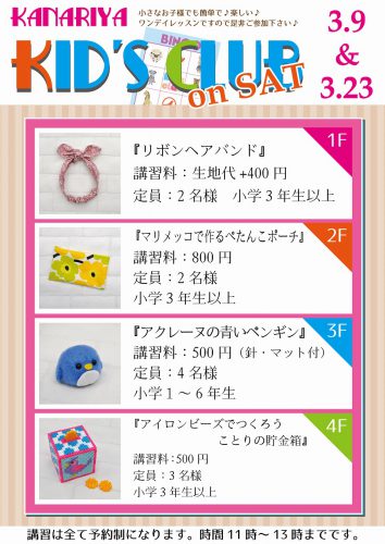 ~本店キッズクラブ ご案内~ 小学生対象のキッズクラブ カナリヤ本店では「キッズクラブ」3月分(3/9・23 土曜日開催)が更新されたのでお...