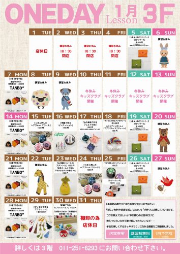 ~3階・4階ワンデーレッスンご案内~(1月分) カナリヤ本店3階・4階では、ワンデーレッスンが充実致しております。 ※終了しました。 ※本店...